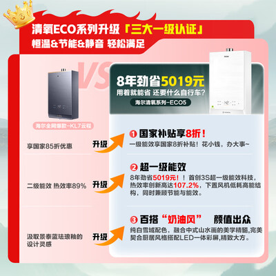 海尔清氧ECO5和海尔清氧ECO7哪个好?区别是?二个海尔清氧ECO5和海尔清氧ECO7区别还是有的哟,经过对比我购的是海尔清氧ECO5,这款海尔清氧ECO5还可以的,整体质感也是蛮强的,说真心的这个海尔(Haier)【清氧ECO5一级能效】16升燃气热水器天然气节能 水伺服恒温 TSI增压188%一级静音【国家补贴20%】可以 哈,做工十分考究,刚购没多久的,由于本地没货,热水器第三天收到,当天就预约好来安装了,效率很高,热水器出水速度很快,恒温效果不错,性价比高 海尔清氧ECO5机器质量好,外观大气,恒温防冻配制,出水速度正常。物美价廉,售后有保证,值得购买。 邻居推荐给我真心不错,用着挺好的,用后来评价推荐给大家,希望能帮到有需要的朋友 商品质量好 物流效率高 商品质量好 流效率高 商品质量好 物流效率高 商品质量好 物流效率高 赶上818爆仓还是第二天就到了,物流还是很给力的,终于又能洗上热水澡了。 这款热水器颜色好,显干净,大小合适,噪音也不算大,物流快,物美价廉,很满意