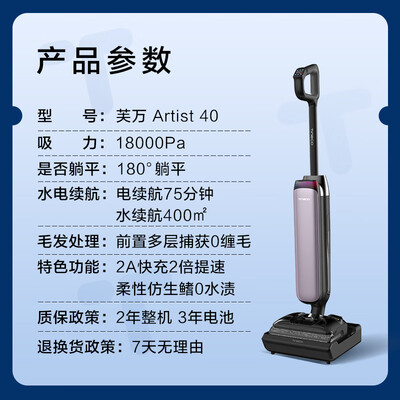 添可芙万Artist40艺术家哪个好?有何区别?添可芙万Artist40艺术家之所以选卡赫就是因为能完全躺平,别的品牌没有一家能做到,还有左右贴边很方便赞一个!非常好用,再也不用担心地上有水印,孩子的长头发也能缠绕,洗脱一体很棒,每天都会用洗地机非常好用,省时省力,快递很快,态度很好很轻巧,很省力,声音并不是很大,性价比比较高!这个价位性价比真的很高了,拖的干净贴边效果也很不错,也可以自清洁。懒人的好帮手。