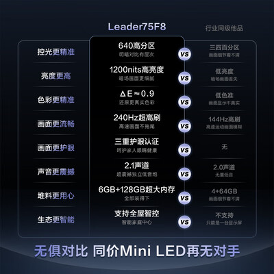统帅海尔Ieader L75F8 75英寸640分区MiniLED智慧屏京东自营6+128G高刷游戏AI电视国家补贴20%一级能效目前活动价:3199.2元!