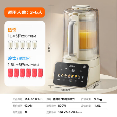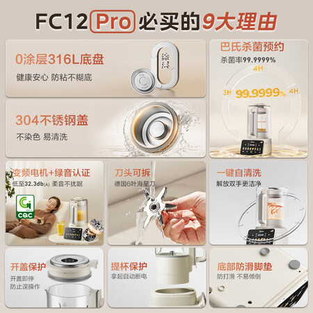 二个美的破壁机FC12Pro和FC12区别不是很大的哈,我订的是美的FC12Pro,这款美的FC12Pro要更好些,看着相当大气,说实话这款美的(Midea)2025新款安睡0涂层破壁机 1.6L家用全自动多功能变频榨汁辅食3-5人五谷杂粮豆浆机FC12Pro国家补贴的确是蛮不错的哟,做工非常讲究,才购买没多久的,静音效果出众 这是该破壁机的特点,的噪音完全在可接受范围内,甚至凌晨使用也不会打扰家人休息。这得益于其搭载的多重降噪技术,能将工作噪音控制在很低的水平,相比传统破壁机噪音显著降低。打磨口感细腻 破壁机打出的饮品口感非常细腻顺滑。无论是豆浆还是杂粮糊,都能打磨得很细腻,没有明显的渣感。有用户特别指出,打出的豆浆浓郁且不易分层。便捷性好评与提示 预约与清洁:预约功能备受青睐,在晚上备好食材预约,第二天早上就能直接享用热饮。在清洁方面,高温清洗功能效果好