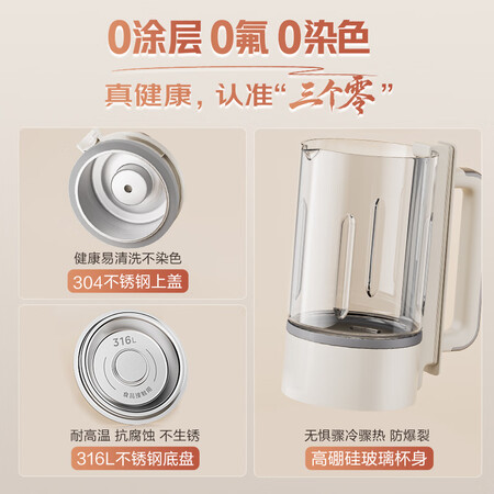 这个破壁机颜值超高,然后也很精致,不占地方,使用起来噪音很小,关上门几乎听不到,打出来的米糊和豆浆也很细腻,口感很好,最后就是也比较好清洗,很满意 破壁机收到了,包装完好,货物没有损伤,机器很有质感,试用了一次,噪音很小,底盘316材质,不用担心涂层剥落,从而影响身体健康,而且刀头清洗也很方便。是一台物美价廉的好机子,值得推荐。