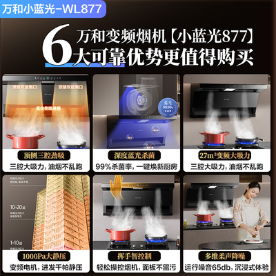 万和(Vanward)【小双翼WL877·蓝光净烟】顶侧双吸抽排油烟机27风量变频三吸杀菌家用大吸力以旧换新国家补贴20%目前活动价:1366.56元!