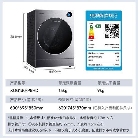 松下(Panasonic)洗衣机洗烘一体 13kg滚筒洗衣机全自动+9kg热泵烘干机家用烘干 【阿尔法】 国家补贴 XQG130-P5HD目前活动价:?9?元!