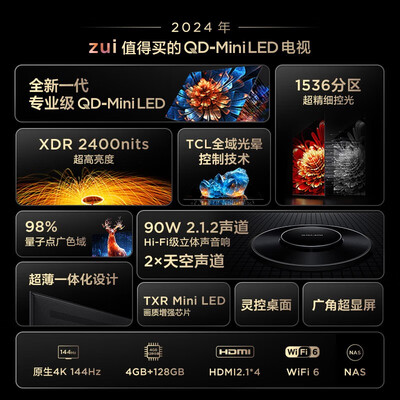 TCL 电视 98英寸 XDR 2400nits 量子点 deepseek AI电视 98Q9K 含挂架安装 目前活动价:25999元!