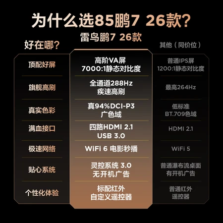 雷鸟电视鹏7 26款配置参数: