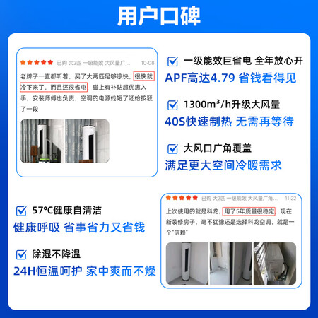 空调表现优异,节能效果显著,制冷制热速度快,运行安静,性价比高,家庭使用非常合适,强烈推荐!好评!安装在机房里的,设备温度很快就降下来了。对的空滤非常满意。空调很好 物流也快 安装师傅很好 有什么不懂的问他都回答 空调制冷效果不错打开没一会屋里就凉快了此广告大三匹,其实才大二匹,误导了消费者,建议别用类似广告。.又买的柜机空调,优惠力度特别大,已经多次购买空调了,性价比很高,值得购买,价格真的好便宜,空调制冷很快。