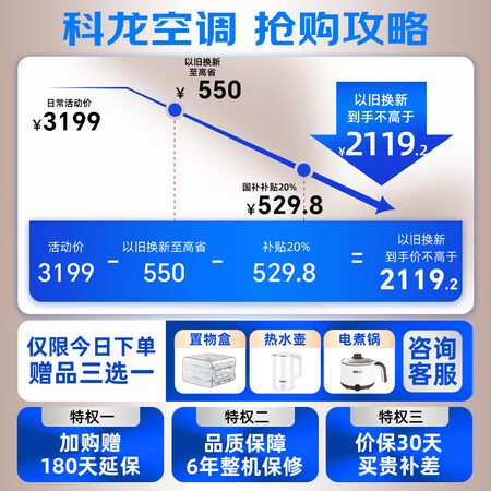 科龙静省电 大2匹空调 新一级变频 WIFI智控 柔风冷暖低噪 家电补贴 客厅立柜机空调KFR-50LWEFLVA1到手价格3199元。
