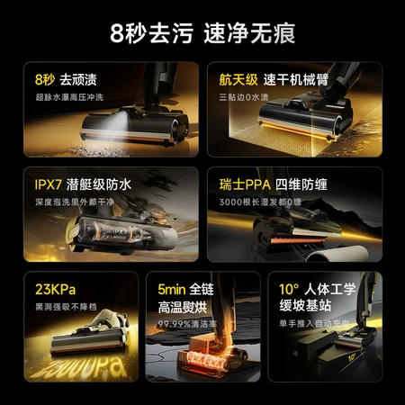 特色功能: 毛发防缠绕 一键自清洁 语音提示 推入式 高温 180°平躺 泡沫洗地 机械臂 脏污智能感应 除菌 智能投放清洁液