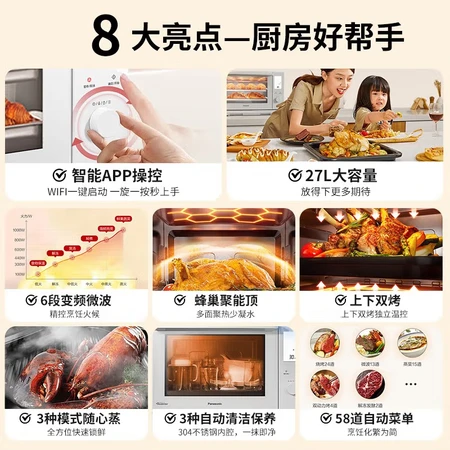 不得不说,对于不大的厨房来说,微蒸烤一体机真的是福音了,可以微波,热个牛奶,馒头,剩菜之类的,简直不要太方便。烤,半成品的鸡翅,薯条简直完美,如果纯生,自己腌制,需要研究一下温度,胜在双动力烤盘太好清洗,任何酱汁,烤成什么样子都可以轻松去除。蒸,100度的上气很快,从未解冻到全熟蒸透需要25分钟左右。炖煮也可以,没有明火快,但是比电陶炉好使。吐槽一下一键加热,很快,一杯牛奶,十几秒就可以加热,但定温不太准确,55度几乎沸腾了。但是方便用。都说各项功能不够强大,我觉得看跟谁比,如果大几千和上万的专业蒸烤箱,