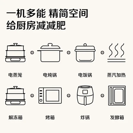 家里厨房小,为了替换之前家里的空气炸锅,蒸锅,微波炉,所以买了这台一体机,一下腾出来不少空间。下蒸上烤的功能不错,启用第一顿就蒸了鲈鱼,烤了鸡翅,味道不错,还节省时间。 使用两周才来评价喽~这个蒸烤微炸一体的万食炉真的太方便啦 代替了家里之前的微波炉、空气炸锅 省了不少空间。使用效果也不错 烤羊排 烤地瓜统统安排上!