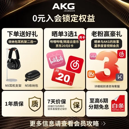头梁很结实 连接处用的是金属 质感非常不错 包装很严实 很有仪式感 akg老牌声学名不虚传 还有耳机包 用料也很扎实 很放心 配件很齐全 延迟很低 希望akg越做越好 耳机收到,包装很好无磕碰,选了白色的感觉很漂亮,试听了下音质,比我老款的q460好很多,先煲一段时间机再看好不好更好些,总体满意 看了不少评测后选定了N9,音质听感偏向监听,2.4 G 链接模式下感受不到延迟,拿来玩CS2听脚步也挺准,就是枪声偏大,需要拉下EQ。对耳机总体很满意