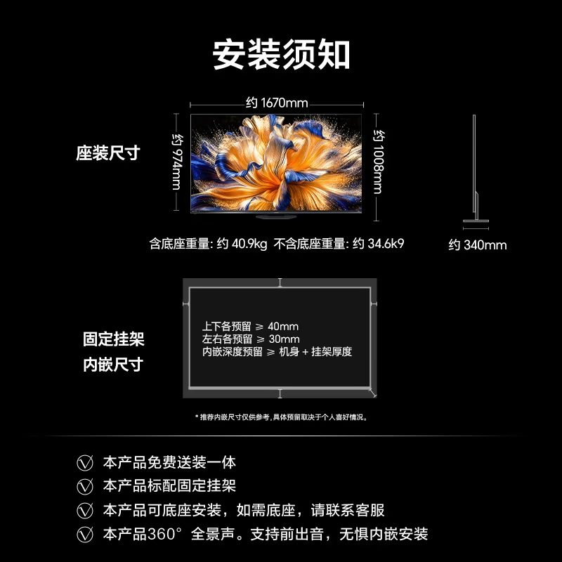 裸机尺寸(不含底座): 厚44mm 高974mm 宽1670mm