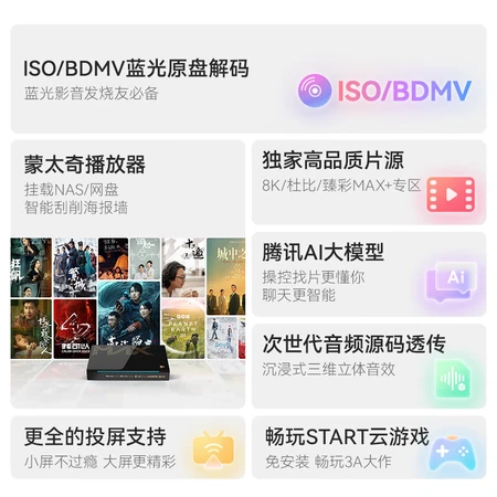 买腾讯极光盒子7S,首先就是看上128G的大内存配置 ,可以随便装软件。另外就是4K高清播放,开机可以直接进入小湃桌面,界面也是高清的,支持杜比视界+全景声的双杜比,还有DTS:X,色彩鲜艳真实,带来视听盛宴。接口有hdmi2.1,光纤输出。接上epson投影仪,120寸播放迅雷云盘杜比视界电影,效果杠杠的。缺点就是有线网速只有100M。USB只有2.0。