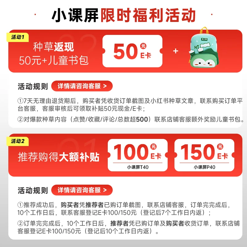 在网上对比了很长时间,最后还是选的小课屏。孩子上网课和妈妈娱乐都很好,屏幕很大,用着也放心,下载App也很方便,孩子课程用到的都能下载,很方便。屏幕效果:屏幕清晰,能自动调整亮度,不刺眼 教学内容:内容丰富,Ai教学 护眼效果:自动调节,很好 服务体验:非常好,客服有问必答!