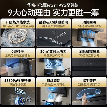 这二款华帝小飞翼Pro至尊版和尊享版配置和款式都是不一样的,整体来说这款是大气不少的,比较推荐入手华帝小飞翼Pro至尊版,给老妈买的,运行时声音很小,吸力很大,做爆炒的菜时不呛人,很棒!还可以自己识别油烟的大小进行风量的控制,很智能,还自带蒸汽洗功能很方便,推荐 华帝油烟机大品牌,准时送货上门,安装服务到位。产品质量很好,做工优质,板金很厚实,摸起来手感好。油烟机吸力大声音小,触摸灵敏。自动清洗方便适用,家里老人使人也方便,反馈挺好的,华帝客户服务态度好。等段时间把家里老油烟机也换成华帝的。