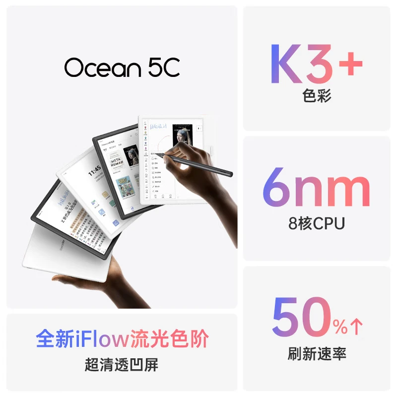 掌阅Ocean5C和4C区别对比看来不算特别的大,都还不错的,相对而言推荐大家入手掌阅Ocean 5C,虽然对比看来不算特别的大,但这个掌阅Ocean 5C还是比较不错的,整体质感强看着相当精致,这个掌阅(iReader)【新品发布】Ocean5 C 7英寸彩屏阅读本电子书阅读器 AI墨水屏电纸书 平板电脑学习便携 星际黑确实是蛮可以的哈,系统超流畅,彩色显示效果很不错。机身很薄,裸机握持手感非常好。彩色屏幕底纹适应良好,不会很突兀,色彩很还原,色彩柔和,比较少残影。搭配的笔还挺好写的。目前黑白文字小说,彩漫,随手笔记这三块是用得最多的,挺好用。这个尺寸也比较合适,走哪带哪。用下来各方面都比较满意。