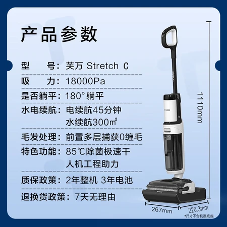特色功能: 毛发防缠绕 垃圾干湿分离 除菌 一键自清洁 180°平躺 清水箱下置