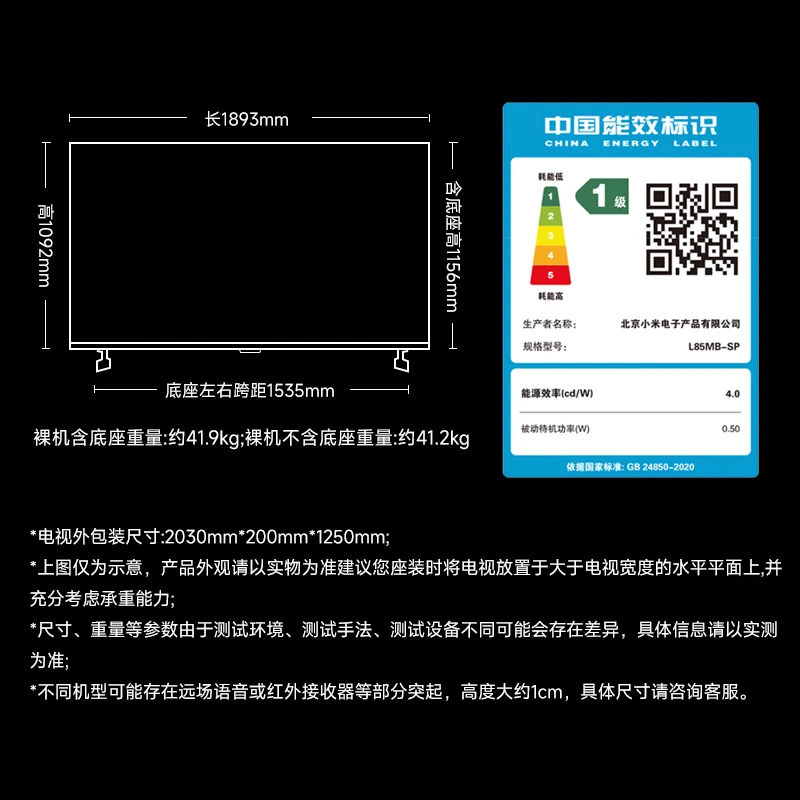 裸机尺寸(不含底座): 厚85mm 高1092mm 宽1893mm