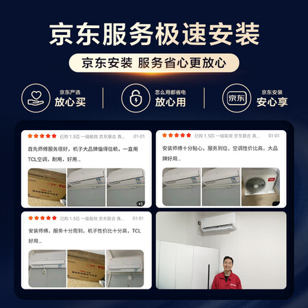 空调TCLKFR-35GWJD21+B1空调很特别好,非常喜欢,外观设计非常好看,安装师傅也很细心,很好的一次购物体验。赞一个?值得推荐?制冷很快,噪音小,目前租客使用感觉良好.。节能效果:很好,制冷效果非常好,安装师傅也挺赞,通电后几分钟家里就凉下来了,声音也小,我这睡觉轻的人也能舒适入睡。第三次购买了,非常不错的一款空调,制冷效果好,即将购买第台了。头天下单,第二天收到货!今天第三天已经装好了!京东买电器省时省力也很放心!安装师傅也很给力!好评!