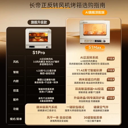 这一次给大家分享下这二款长帝烤箱S1Pro与S1Max区别不是算特别的大,都挺不错的,相对而言推荐大家入手长帝S1Max,烤箱很好用,颜色也很干净,里边的功能特别强,通过视频了解了操作,做了一个蛋糕,效果很惊艳,内部空间很大,上下6 根那个加热管加热速度更快了,功能使用也很简单很赞! 长帝S1Max颜值能打容量足,30道菜单+精准温控,新手也能轻松解锁美味~第一次烘焙就非常成功!信心翻倍!爱了!里面也非常好清理一擦就掉~超省心