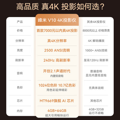 峰米 V10 4K超高清 游戏投影 投影仪家用 投影机(2500ANSI流明 画面智能校正 240Hz高刷新率 AI画质增强)到手价格6699.0元。