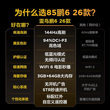 已经属于还不错了的。现在终于可以在家看电视了。师傅安装快捷。技术也不错。对我小三房75寸上墙真的还可以。尺寸非常适合哦。热爱生活,善待自己,新周愉快 TCL雷鸟鹏6 26款55英寸太值了!94%DCI-P3高色域搭配144Hz高刷,色彩鲜艳逼真,运动画面丝滑无拖影,看赛事、大片都有沉浸感。3+64GB大内存超够用,装再多应用也流畅不卡顿,开机无广告秒启动超省心。金属底座稳固大气,远场语音操控灵敏,莱茵低蓝光认证久看不累眼,同价位性价比拉满,全家都满意!