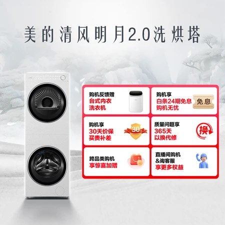 美的清风明月2.0PROMAX、MAX、PRO和AIR洗烘套装区别不是很大的,都差不多的哈,建议选择美的清风明月2.0PROMAX,外形外观:远山青这款真的非常好看,尤其是表面的特殊花纹很有质感。因为这款洗衣机和烘干机是有电源线束连在一次的,所以只需要在机器上方就可以同时控制两个机器,图标很直观很好看。洗净效果:试着洗了一锅衣服,很干净,甩得也比较干,还没试烘干功能,噪音不大,关上卫生间门就几乎听不到了。双十一期间入手,优惠比较大,到货后客服联系安装也很主动及时,推荐购买