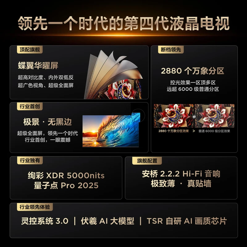 这款电视关注很久了,国补抢不到等到了双十一的好价格。MiniLED亮度很高,色彩也很不错。边框跟窄,坐在沙发上看基本没有。自带的超薄挂架很好用,非常贴墙,还可以从底部抬起来插线。系统还行比较简洁。京东送装一体好评,但是安装师傅只有一个,85寸的电视还是得2个人比较好。还好师傅安装没问题,装的时候一直竖着,也没有捏到屏幕 边框比较隐形,看起来比较高大上,视觉效果不错 比买到了心仪的商品,物美价廉,质量好得没话说。物流顺畅,商家服务细致,售后服务靠谱。