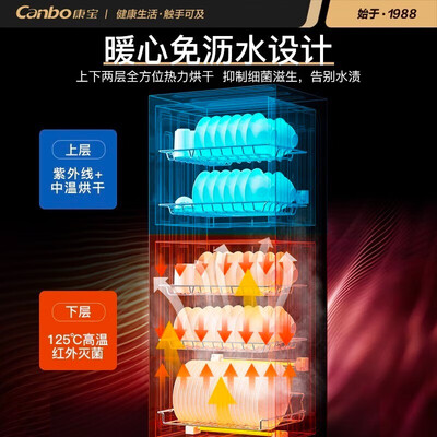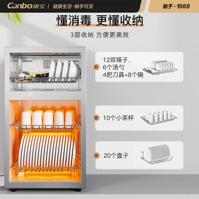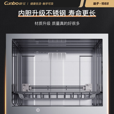 康宝(Canbo)消毒柜外观符合预期,不锈钢内胆光洁靓丽,容量挺大,满足我们一家5口了,没有奇怪气味。老品牌值得信赖,疫情期间买个消毒碗柜。为了家庭的健康,必须买一个。。。外观大气,性价比很高,容量大。适合家用。尺寸正好合适,再高一点就放不下了,烘干效果还不错,上下室不同消毒方式比较实用。