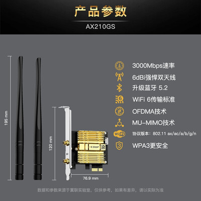 翼联EP-AX210GS非常不错,实测可达1300M可以用于千兆宽带即插即用,非常方便,网速和网络的稳定性都很好用了这个网卡,就算是连wifi用笔记本打游戏都超顺,延迟只有十几,wifi就一颗信号,这个网卡都能稳稳的2018年买的电脑,联想-刃7000Ⅱ,自带的无线网卡是AC3165,换上AX210后可以用,但是需要自己安装驱动,联想官网可以下载。测速能跑到800,稳定性和蓝牙功能还没测试。