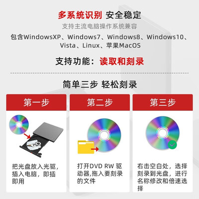 ThikPadTX800好用,很不错,插上就可以用了,很顺滑!值得购买。新购买了联想小新PRO16,这款笔记本不带光驱,但有时要用到光盘上的资料,所以选了该款外置DVD光驱。外观小巧,颜色很正,做工精细。无需安装驱动,即插即用,读盘速度很快,声音很小,刻录功能还没用过。满意。读盘速度:读盘速度非常快。读盘声音:没有读盘声音,不像台式机光驱声音很大。稳定性能:今天拿到光驱,就迫不及待的刻了一张DVD盘,8倍速刻录,很稳定。轻薄程度:外置刻录光驱厚度适中。外形外观:外观是大众化的银灰色,很喜欢。这么热的天气,为京东商家及快递小哥点赞!读盘声音:静稳定性能:稳定读盘速度:不错,轻薄程度:很轻薄的