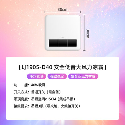 美的LJ1905-D40挺好的,自己家里装了一个,又给岳父家装了一个。安装好发现师傅接线有点问题开两次开关灯才亮,自己又多接了一盏灯。选了好久才找到的这一款性价比很高的凉霸,夏天再也不怕做饭的时候热了不错不错,很实用,安装师傅很到位,都免费,会想方案会推荐一下的!!安装师傅很细心,还帮我贴了小纸条,提前约了时间。