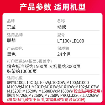 京呈LT100LD100外包装完好,快递员给力,暂时还未使用,待使用后评价,希望好用,会继续回购可以说是物美价廉啦,比官方正品便宜太多啦,专门儿。到货之后还试了一下,打的很清晰,很浓。非常推荐购买,有问题,售后解决的也很快,简直不要太棒。外包装完好,快递员给力,暂时还未使用,待使用后评价,希望好用,会继续回购一次购买了两个,试用了几天非常好,打印字体清晰,定影牢固。原装的价格太高了,这款代用的经济实惠,特别适合打印量不大家庭用户使用,?。