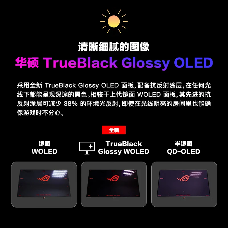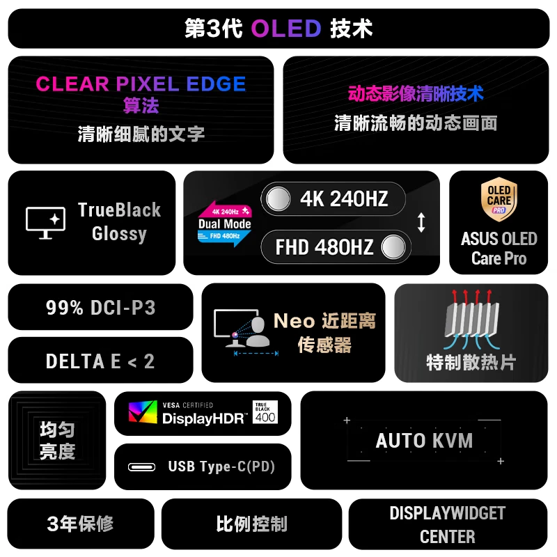 第一次用oled屏,在多个品牌中,纠结了很多天,最后选择了rog,因为相信rog的品控和售后。23号晚上下单,24号就送来了,外包装完好,安装也很简单,即插即用。屏幕完好,显示效果很棒。 外形外观:信仰之眼亮起来特别好看。显色效果:27寸4k显示效果清晰无拖影还是高刷新,打游戏比之前更流畅了。外形外观:华硕就是帅尺寸大小:27寸4k躺着玩3a正合适游戏效果:多个预设模式满足大部分需求刷新率:160hz足够玩3a了显色效果:色域广