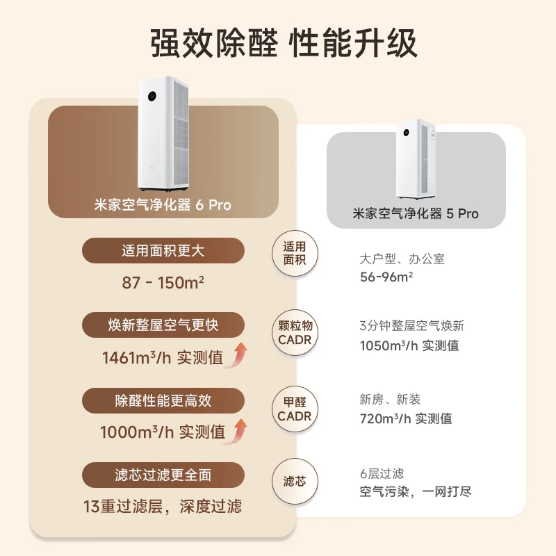 挑了好几天,考虑到可以联动小米智能家居,还是买了小米。原来家里有个4pro,正好看到6pro首发,颗粒物和甲醛吸附能力提高不少,抱着试试看的态度买了,希望质量耐用 用后小米空气净化器6 Pro真不错!CADR值高,净化速度快,APP智能控制很方便。机身小巧不占地,滤芯更换简单,除甲醛和除异味效果明显,性价比很高,值得入手!