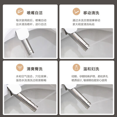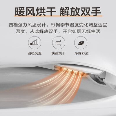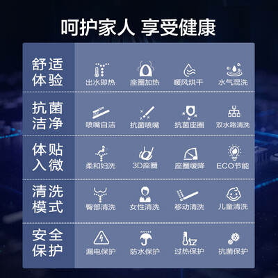 功能:暖风烘干,臀部清洁,座圈加热,喷嘴自洁,喷嘴移动清洗,女性清洗,儿童清洗,记忆功能,净化水质,一键操作