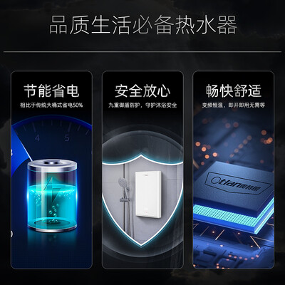 奥特朗(otlan)电热水器已经买第四台了,好用又不占地方。值得推荐!评价还有礼品送!外观小巧,出水温度变化不大(主要受流量影响会有些许变化),恒温设备!语音系统方便远程应用。7000w功率适合大多数楼房原有线路!师傅安装很快,态度很好!质量可以,水加热很快,中间停下来,然后再打开,水也不会很凉自己安装用了1个小时没费什么力很好.问了客服火线零线地线的色.客服很客气呀,一一解答谢了。