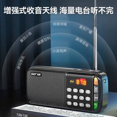 先科(SAST)收音机很不错的收音机,非常适合老人使用,声音够大,操作简单方便,功能齐全,续航时间长,外观设计简洁美观,很满意,听评书刚刚好。出货快物流速度。收到宝贝,听起来感觉很好!希望可以给老爸带来快乐做工质感:质感不错音质音效:音效良好操作难易:操作简单易上手信号接收:好惊呆了,功能牛,多功能切换,支持存储卡、u盘、收音机!收音机搜台自动存储很方便,u盘自动识别播放,赠送的存储卡5000首歌曲戏曲评书真过瘾!家里老人的好伴侣,房间里放个广场舞音乐也不错,物有所值。音量可以,放到12左右合适。