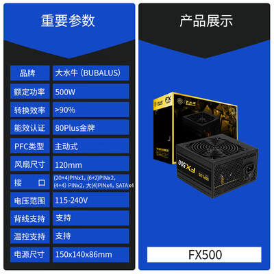 图文解密大水牛FX500金牌电源质量靠谱不?是否值得入手!讲实在话这款大水牛(BUBALUS)额定500W FX500电脑电源(80PLUS金牌认证主动式PFC宽幅背线12CM智能温控风扇)非常OK的,电源包装完好送货及时,****很好,没有泡沫包裹紧密可避免振动,通电测试正常,静音效果不错,电压输出稳定,接口设置合理够用。 质量非常不错,比鑫谷850W还好,功率够用,现在安装在机器里带P40呢 大水牛(BUBALUS)电源大水牛这牌子听着好像有点有趣,其实已经很多很多年了,做的东西还算是靠谱的,尤其机箱里面那个跑量的飓风型号,贼好用,电源这个也挺稳定,办公机器随便带啊缺点:转速很快,风量很大,噪音明显。想静音的误入。优点:性价比很高,相比300w,400w是主动式pfc,有一二级emi,用料好不少,推荐购买。双路设计带10400f+1650s完全没问题,功耗很低。