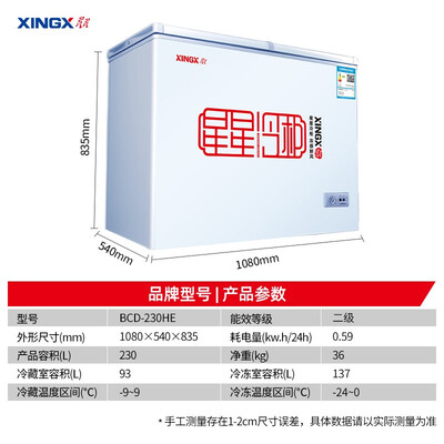 星星BCD-230HE星星老牌子了,质量没毛病,容量很大,经济实用性,值得购买外形外观:外观漂亮,新换的篆书星星冷柜提升了产品的逼格,冷柜的把手也比较实用,冷柜的静音效果很不错,几乎没有噪音。容量大小:容量不错,213升可以放很多东西。买了有一个月了特意现在才来评价。不用就没法说是吧。用了那么长时间也是确实好用,空间也够大可以放200斤肉,哈哈哈,真好。有需要的宝宝们赶紧下手呀。产品很好,几间店都是用星星这个品牌,静音,制冷效果很好,价格还便宜,值得购买!