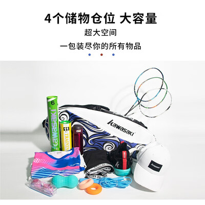 川崎(KAWASAKI)羽毛球包空间大,配置合理,存放球拍的有保护作用。鞋带非常方便。另外,样子也非常酷。不得不说这包的性价比很高,外观不错,主要看中有放球拍的那层是隔热的铝膜层。也有专门放鞋子的隔层,不过确实没有透气孔...是有点味儿这两天放阳台在吹...已经是第二次买这个牌子的的羽毛球包,时隔三年之前的款式已经没有了,现在买的这个款式也不错,虽然是比原来的包小一点,但是用着还不错。包的容量很大,有四个仓位,放鞋水杯放衣服绰绰有余。材质颜值也很完美