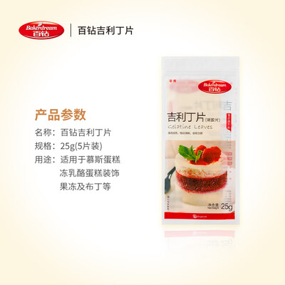 百钻百钻吉利丁片25克买了做慕斯蛋糕的,一直买这款奶油,性价比超高,奶味浓郁,非常不错,自己做的材料干净卫生,吃着放心,经常买这款,以后还会用这个百钻吉利丁粉10g*6袋家用食用明胶粉奶酪棒慕斯蛋糕布丁烘焙原料吉利丁片做了一个芒果慕斯,味道还不错哟,一包刚好够做一个6寸的芒果慕斯。好用好用,这个牌子的吉利丁是真的好用,定型效果杠杠滴,口感也很细腻,做出的东西很均匀,泡发时间很快,水溶性真的是不错,优于同产品其它品牌。