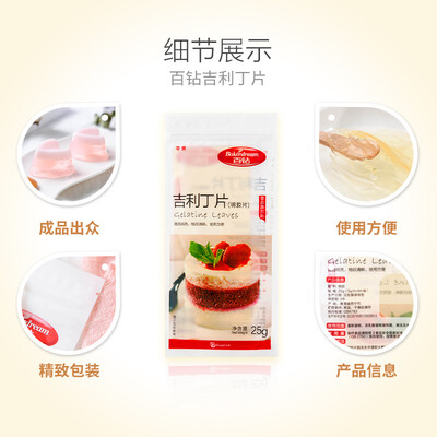 百钻百钻吉利丁片25克给孩子做的芒果布丁放在冰箱里冻一下,孩子特别爱吃。产品包装精致美观大气,目前用着非常不错,真实评价,希望可以帮到集美们发货及时,包装结实,清透无异味,快速溶解,家庭烘焙好帮手。吉利丁片是做慕斯蛋糕和布丁的必备原材料,非常好用,也没有异味,在家也能享受高质量甜品,哈哈