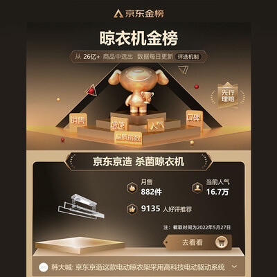 京东京造JZLYJ01还不错,可声控,可遥控,希望不要有质量问题智能的语音可以操作,就是杆子看着起来单薄了点不过不到700嗯价格还可以了发货及时,产品质量有保证,安装师傅也不错,满意发货速度还挺快的,到货及时,给送到家门口。安装师傅安装也挺好,速度挺快的。晾衣架性价比很高了,带语音控制,带遥控控制,试了一下非常不错,等入住之后看下承重怎么样