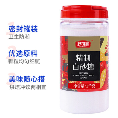 舒可曼精制白砂糖1kg京东物流超级给力,舒可曼糖经常回购它这个包装特别好,瓶口很方便倒使用,好评。刚买了松下自动面包机,赶紧照着菜单采购所需,除了盐计量不对(250g面竟然让加5g盐,结果变成了咸面包)堪称完美,太好吃了,比街上卖的好吃很多很多每每做威风蛋糕都用这个砂糖,很好用,尤其是砂糖带口的设计,直接不漏,特别好用,速溶细腻,口感非常不错?买过很多次,谢谢京东快递送货快,辛苦了一直喜欢在京东上购物,主要就是看中京东快递的时效性,自营产品都是上午下单下午到,下午下单第二天上午到,这种购物体验真的非常爽,
