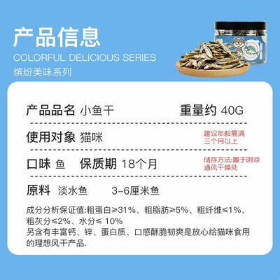 憨憨乐园罐装鱼干40g适口性:不知道什么猫爱吃,反正我这猫闻了闻就跑了味道:薄荷味产品包装:包装很好,可以随机给多少产品分量:挺大一包,可以陪着猫粮吃,就是我这臭猫不吃......随他去吧猫猫挺爱吃的,给他们补补钙,但是就是价格有点贵,一包的重量都是添加的那个干燥剂我家小猫?一直在吃这款小鱼干,小鱼干挺香的。价格实惠,质量杠杠的,非常好的一次购物,下次还来