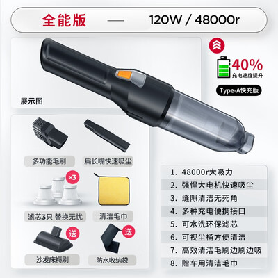 志高(CHIGO)无线车载吸尘器家用车用大吸力迷你随手吸锂电汽车桌面手持除尘机 120W豪华款+滤芯3+沙发刷收纳袋到手价格99.0元。