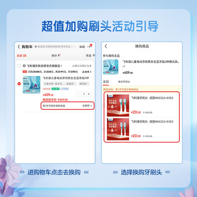 飞利浦(PHILIPS)电动牙刷第三次买了之前买过送人因为真的好用啊!这次赶上618买的活动超级给力了之前买下来都要330多这次270左右哎!还额外赠送2个刷头简直不要太划算之前买的送的是牙刷盒性价比没有这次的刷头高第二次购买飞利浦的儿童电动牙刷了,大牌值得信赖有趣的互动式刷牙,还有app可以下载安装。一边刷牙一边享受互动乐趣,改善刷牙效果!儿童声波震动牙刷,让孩子从此爱上刷牙,消灭口腔细菌!第三次买了之前买过送人因为真的好用啊!这次赶上618买的活动超级给力了之前买下来都要330多这次270左右哎!还额外赠送2个刷头简直不要太划算之前买的送的是牙刷盒性价比没有这次的刷头高