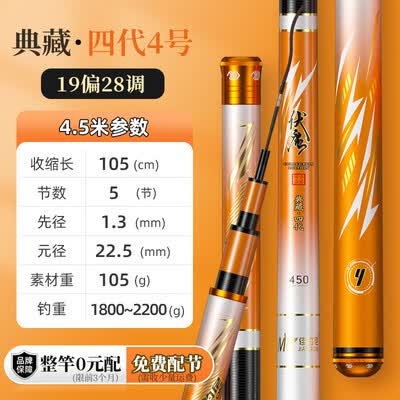 商品名称:佳钓尼(JIADIAONI) 伏魔典藏鱼竿超轻超硬台钓竿28调鲫鱼竿鲢鳙鲤钓鱼竿手竿碳素钓竿渔具 典藏四代4号4.5米【赠原装竿稍】 超硬台钓竿