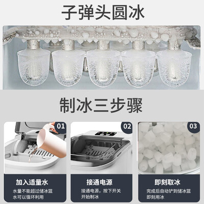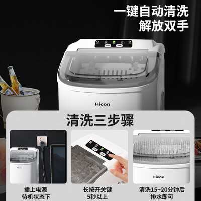 惠康(HICON)制冰机小型家用宿舍学生15KG迷你寝室全自动圆冰块夏天必备神器,自从买了这个制冰机以后,天天用,就没哪天不用的,太爽了,炎炎夏日太舒服了。一杯冰可乐,安逸。言归正传,制冰速度10分钟以内,我都是开机以后不管,想喝就去加,每次去都有冰,保温效果还行,冰化了又制冰,爽啊,但我还是提点建议,能够wifi控制就好了,下班回家前定时开机,到家就有冰吃,多安逸。建议买带自动清洗功能的,我这个没有,清洗有点麻烦。还有大小合适,看着很精致。很好用。制冰速度挺快的而且还可以存储很多冰块非常好用好评发货很快,下单的升级款,有自动清洗功能,自动清洗效果不错,制冰速度一般,选的大冰程序不错,化的慢,饮料降温效果好,使用非常方便,价格不错适合小酌,每天来一点,清暑解渴,棒棒哒500秒九块冰,做好要及时拿出来放进冰箱冷冻,机器本身没有保温的功能,放久了冰块会化掉。不锈钢外壳很好清理,看起来也不错有质感。工作噪音还是有的,不过放在厨房里,人在外面就听不见了。